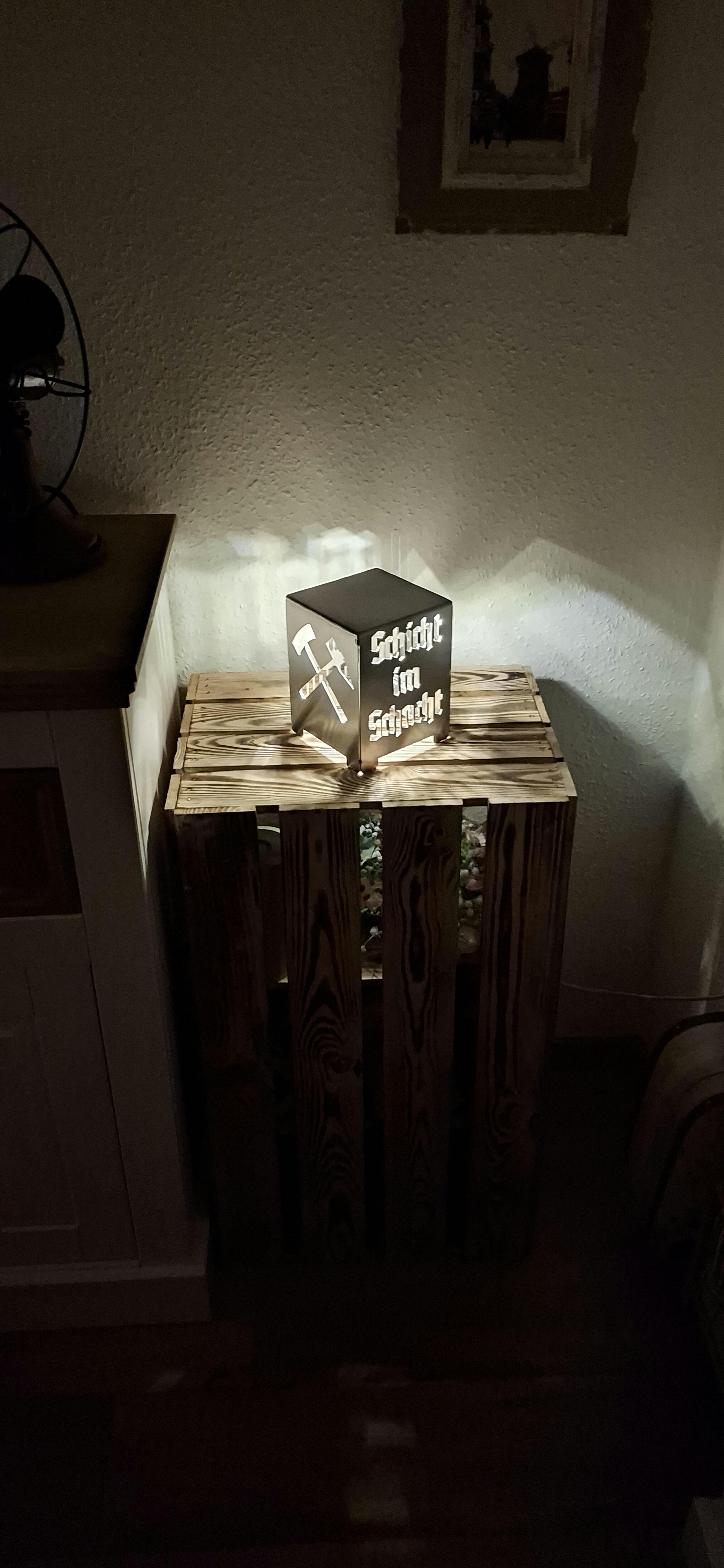 Das Design des Teelichthalters ist besonders bemerkenswert. Auf zwei Seiten prangt der prägnante Satz "Schicht im Schacht", während auf den anderen beiden Seiten ein kunstvoll gestaltetes Abbild von Schlägel und Eisen herausgeschnitten wurde. Diese Details verleihen dem Teelichthalter eine industrielle und gleichzeitig moderne Ästhetik.