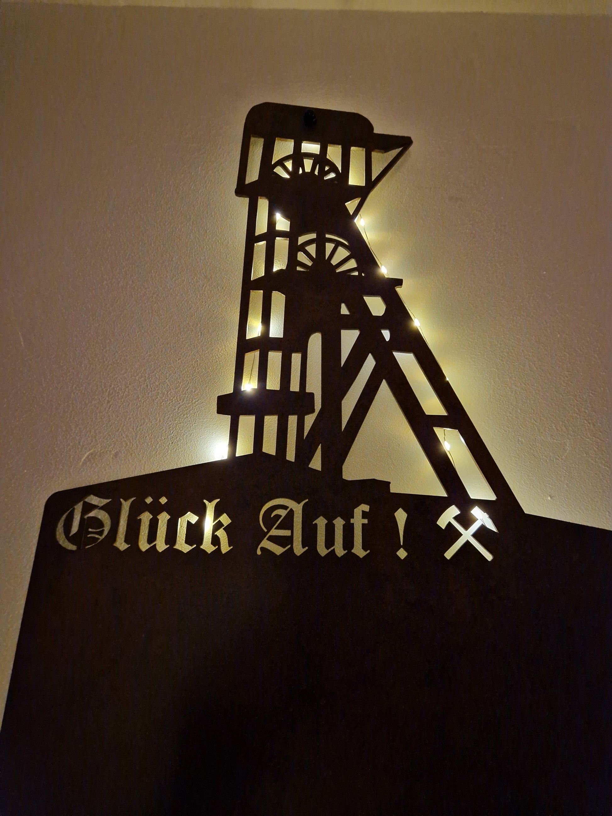 Oben ziert das ikonische Zechengerüst das Design, darunter der typische Ruhrpott-Gruß „Glück Auf!“ – ein Hingucker, der sofort Heimatgefühle weckt.